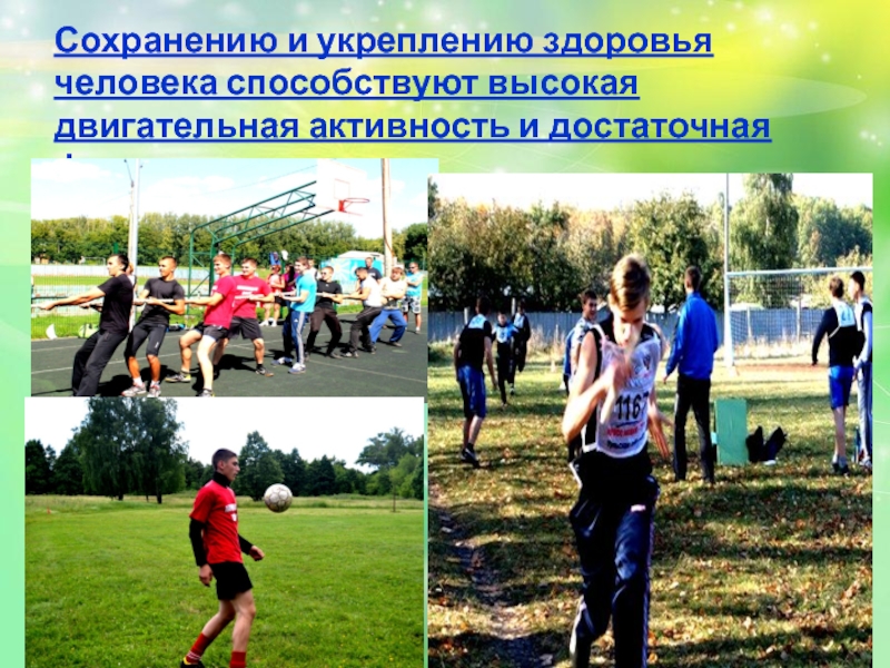 Слайд 7Сохранению и укреплению здоровья человека способствуют высокая двигательная активность и достаточная
