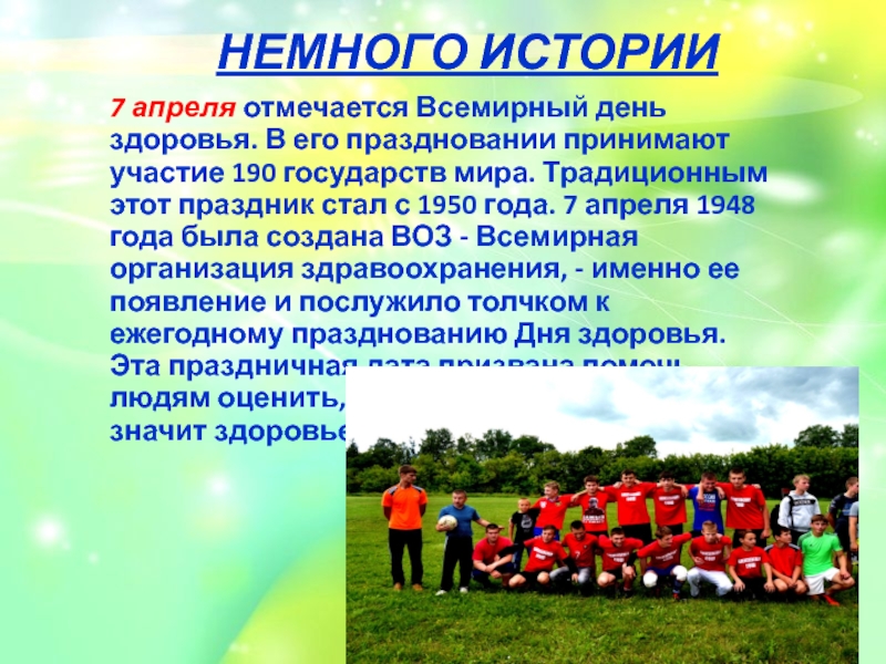 участие 190 государств мира. Традиционным этот праздник стал с 1950 года. 7 апреля 1948 года была создана ВОЗ - Всемирная организация здравоохранения, - именно ее появление и послужило толчком к ежегодному празднованию Дня здоровья.