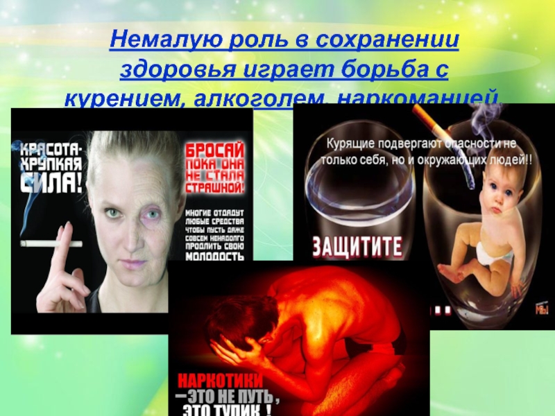Немалую роль в сохранении здоровья играет борьба с курением, алкоголем, наркоманией.