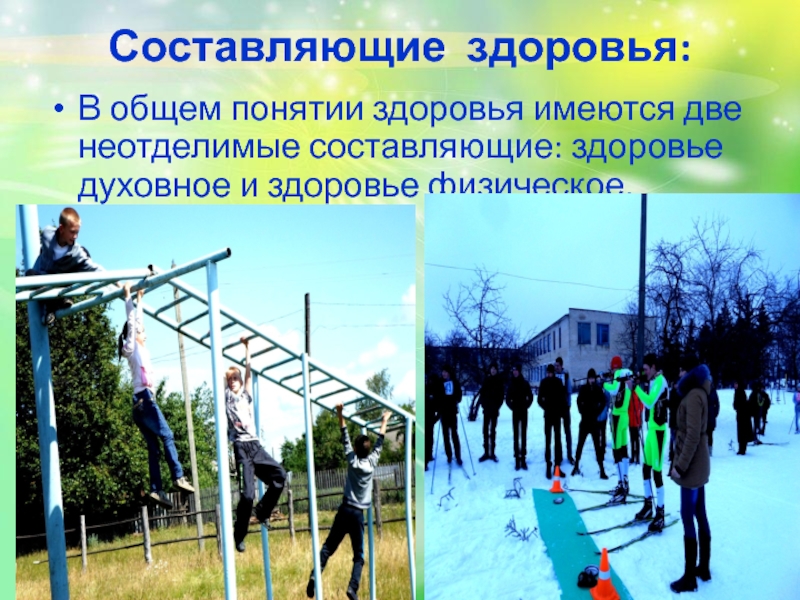 Составляющие здоровья: В общем понятии здоровья имеются две неотделимые составляющие: здоровье духовное и здоровье физическое.