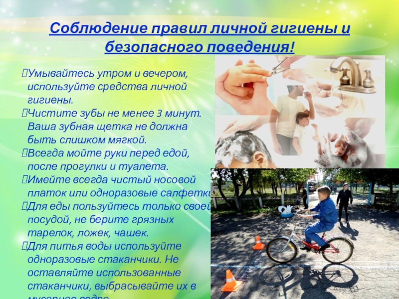 Соблюдение правил личной гигиены и безопасного поведения!Умывайтесь утром и вечером, используйте средства личной гигиены.Чистите зубы не менее