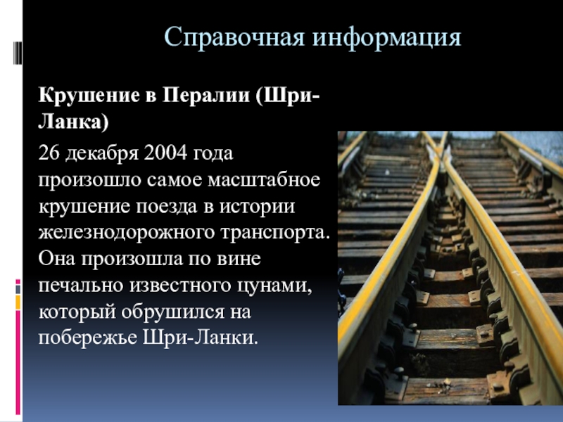 крушение поезда в истории железнодорожного транспорта. Она произошла по вине печально известного цунами, который обрушился на побережье Шри-Ланки.