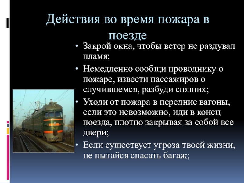 Уходи от пожара в передние вагоны, если это невозможно, иди в конец поезда, плотно закрывая за собой все двери;