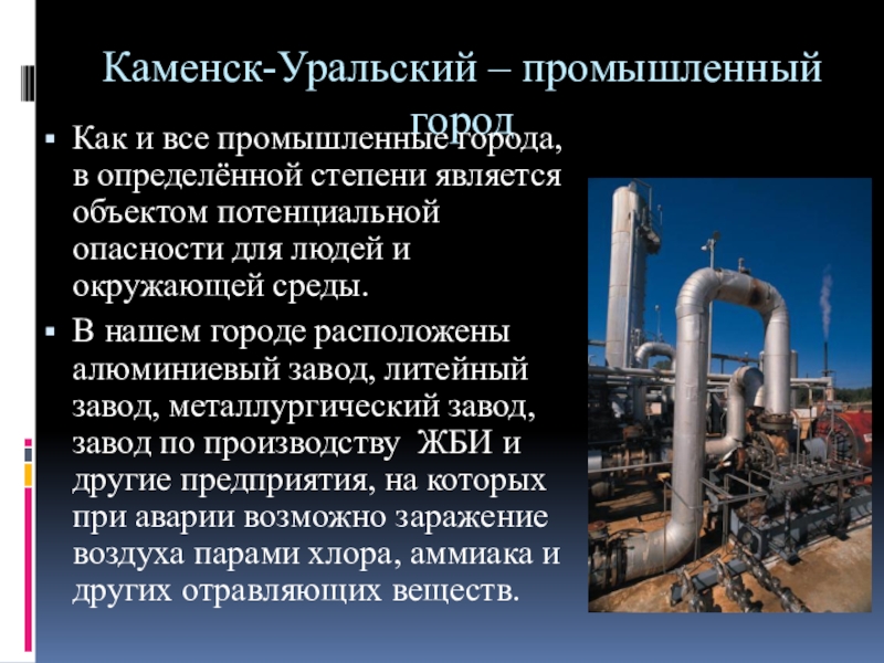 В нашем городе расположены алюминиевый завод, литейный завод, металлургический завод, завод по производству ЖБИ и другие предприятия, на которых при аварии возможно заражение воздуха парами хлора, аммиака и других отравляющих веществ.