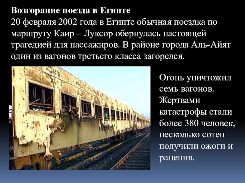 по маршруту Каир – Луксор обернулась настоящей трагедией для пассажиров. В районе города Аль-Айят один из вагонов третьего класса загорелся.