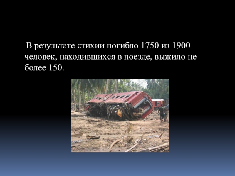 Слайд 16 В результате стихии погибло 1750 из 1900 человек, находившихся в поезде,
