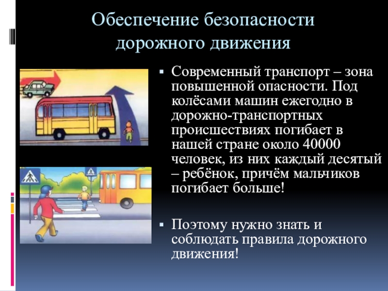 машин ежегодно в дорожно-транспортных происшествиях погибает в нашей стране около 40000 человек, из них каждый десятый – ребёнок, причём мальчиков погибает больше!