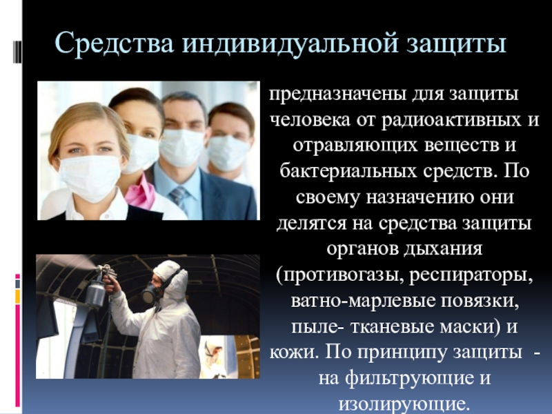 и бактериальных средств. По своему назначению они делятся на средства защиты органов дыхания (противогазы, респираторы, ватно-марлевые повязки, пыле- тканевые маски) и кожи. По принципу защиты - на фильтрующие и изолирующие.