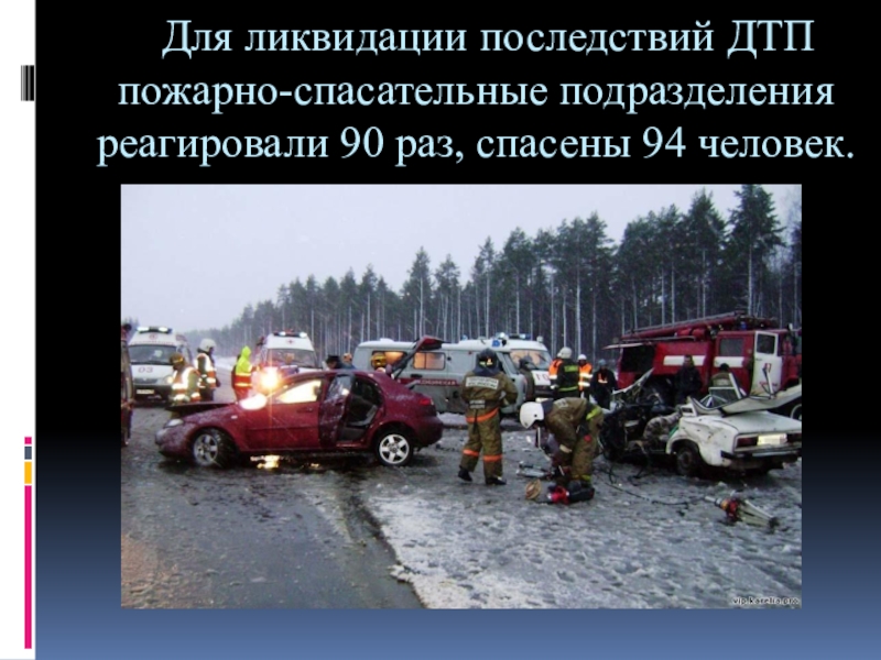Слайд 6 Для ликвидации последствий ДТП пожарно-спасательные подразделения реагировали 90 раз, спасены