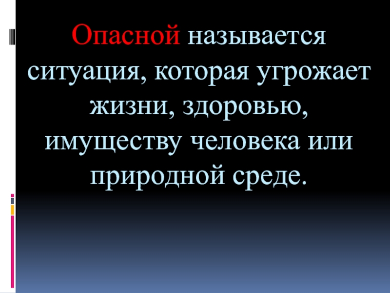 Слайд 8Опасной называется ситуация, которая угрожает жизни, здоровью, имуществу человека или природной