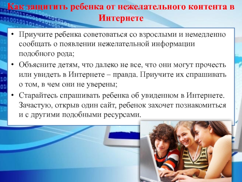 Старайтесь спрашивать ребенка об увиденном в Интернете. Зачастую, открыв один сайт, ребенок захочет познакомиться и с другими подобными ресурсами.