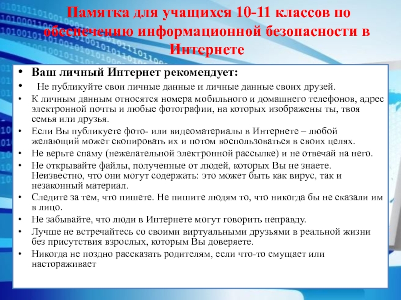 Памятка для учащихся 10-11 классов по обеспечению информационной безопасности в