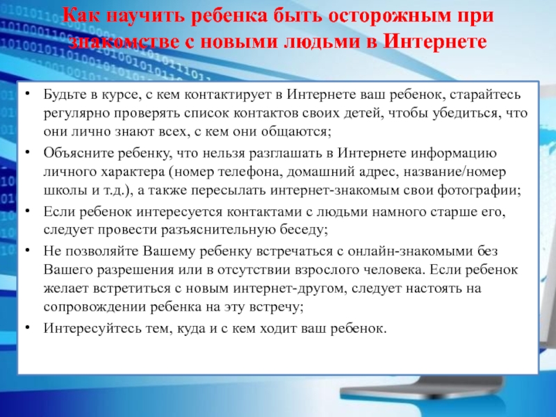 Не позволяйте Вашему ребенку встречаться с онлайн-знакомыми без Вашего разрешения или в отсутствии взрослого человека. Если ребенок желает встретиться с новым интернет-другом, следует настоять на сопровождении ребенка на эту встречу;