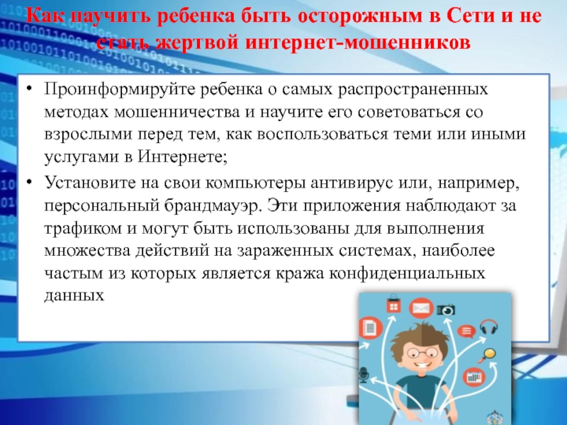 ребенка о самых распространенных методах мошенничества и научите его советоваться со взрослыми перед тем, как воспользоваться теми или иными услугами в Интернете;
