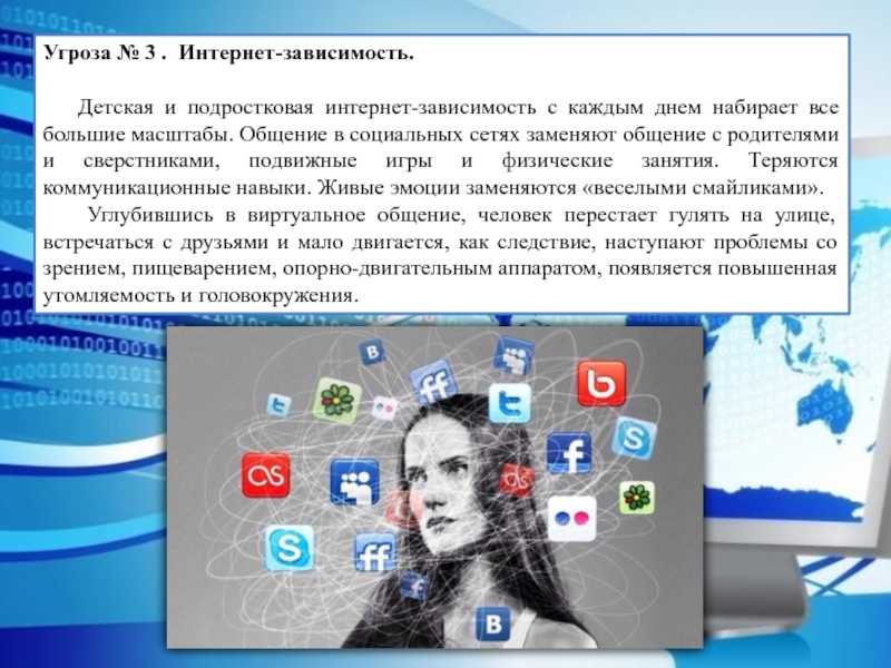 Слайд 6Угроза № 3 . Интернет-зависимость.