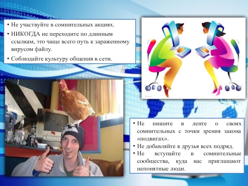Не встречайся с людьми, с которыми познакомился в Интернете, без родителей. Многие люди выдают себя не за тех, кем являются на самом деле.