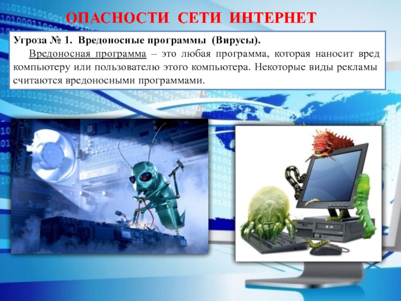 Слайд 4Угроза № 1. Вредоносные программы (Вирусы).