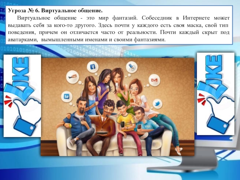 Слайд 9Угроза № 6. Виртуальное общение.