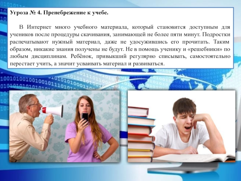 Слайд 7Угроза № 4. Пренебрежение к учебе.