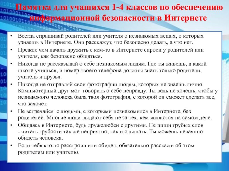 Памятка для учащихся 1-4 классов по обеспечению информационной безопасности в