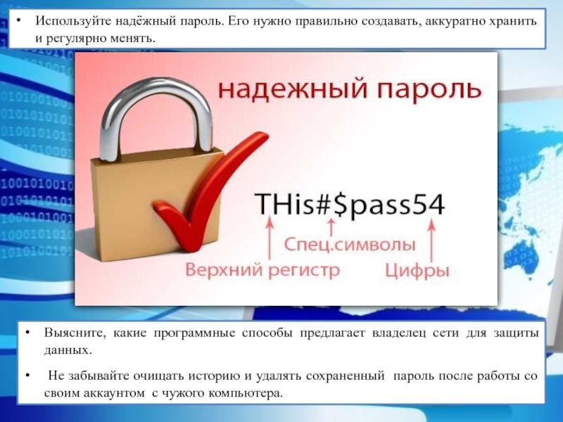 Слайд 13Используйте надёжный пароль. Его нужно правильно создавать, аккуратно хранить и регулярно