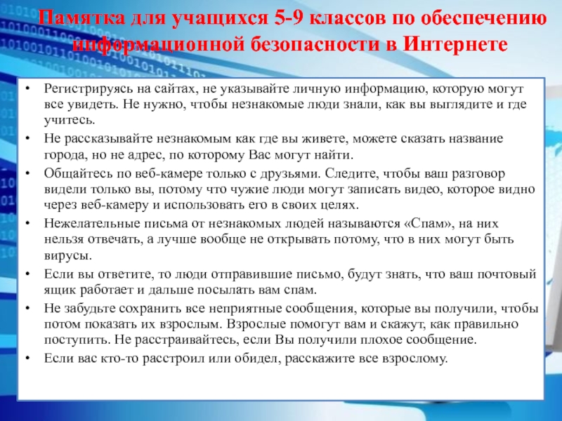 Памятка для учащихся 5-9 классов по обеспечению информационной безопасности в
