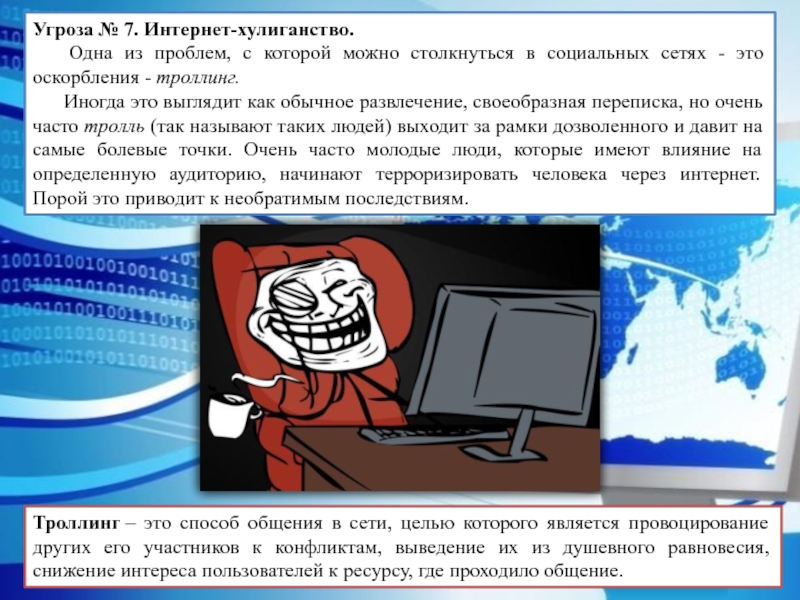 Слайд 10Угроза № 7. Интернет-хулиганство.