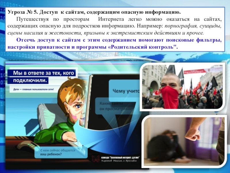 Слайд 8Угроза № 5. Доступ к сайтам, содержащим опасную информацию.