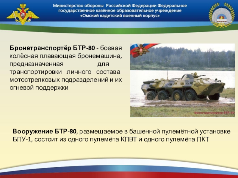 Вооружение БТР-80, размещаемое в башенной пулемётной установке БПУ-1, состоит из одного пулемёта КПВТ и одного пулемёта ПКТ
