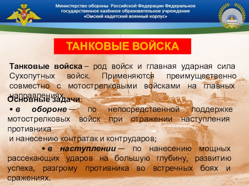• в наступлении — по нанесению мощных рассекающих ударов на большую глубину, развитию успеха, разгрому противника во встречных боях и сражениях.