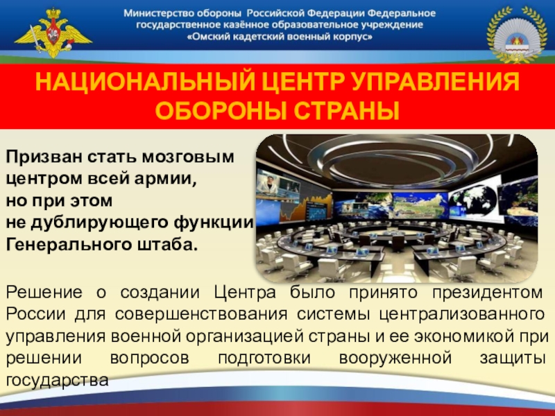 Решение о создании Центра было принято президентом России для совершенствования системы централизованного управления военной организацией страны и ее экономикой при решении вопросов подготовки вооруженной защиты государства