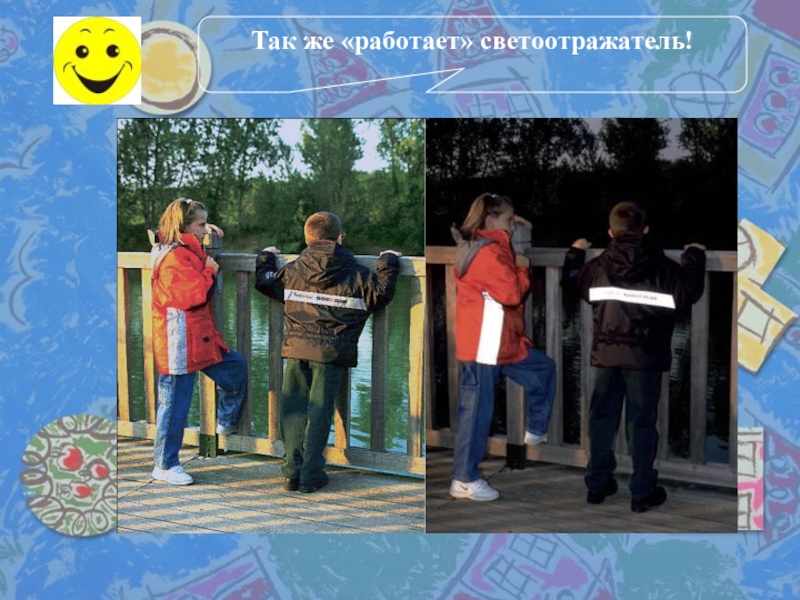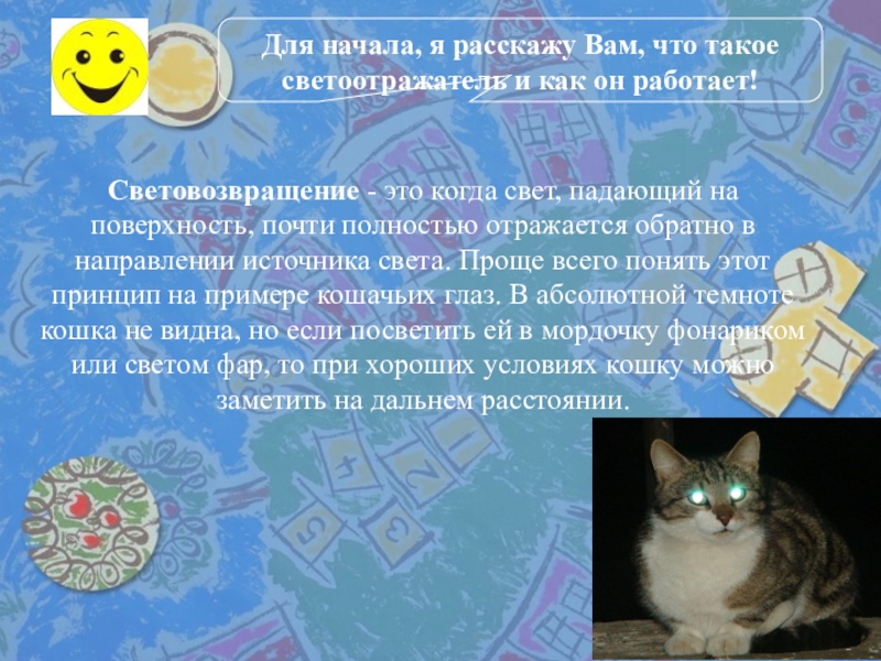 Световозвращение - это когда свет, падающий на поверхность, почти полностью отражается обратно в направлении источника света. Проще всего понять этот принцип на примере кошачьих глаз. В абсолютной темноте кошка не видна, но если посветить ей в мордочку фонариком или светом фар, то при хороших условиях кошку можно заметить на дальнем расстоянии.