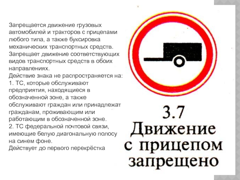 Слайд 9Запрещается движение грузовых автомобилей и тракторов с прицепами любого типа, а