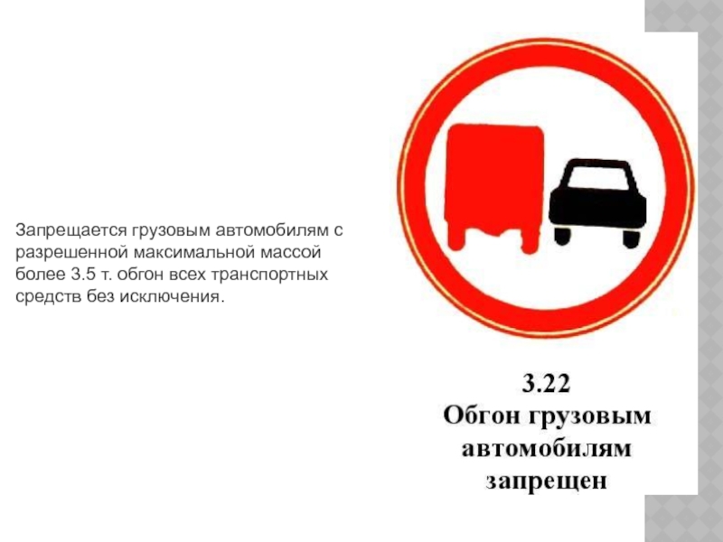 Слайд 27Запрещается грузовым автомобилям с разрешенной максимальной массой более 3.5 т. обгон