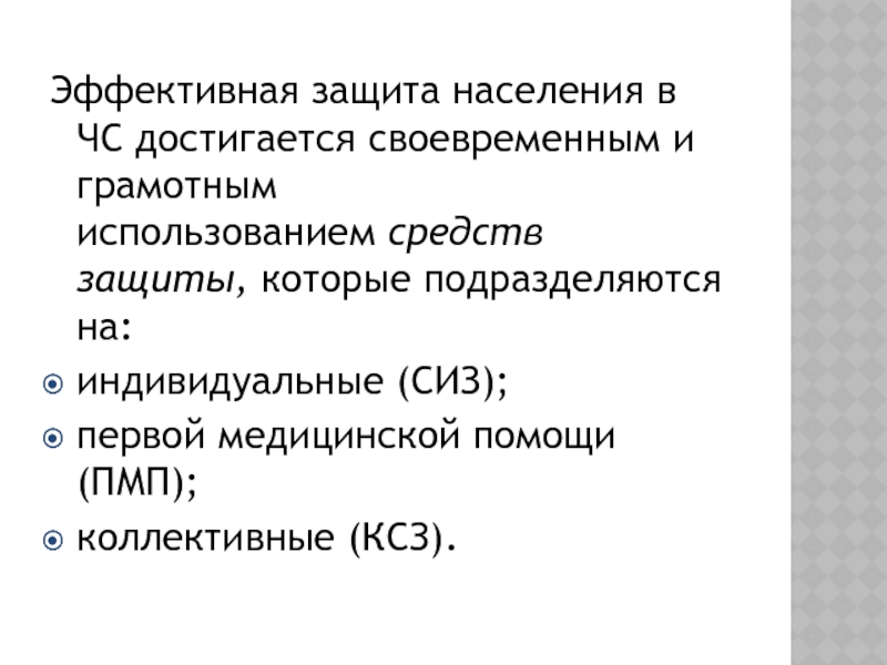 Слайд 21Эффективная защита населения в ЧС достигается своевременным и грамотным использованием средств защиты, которые