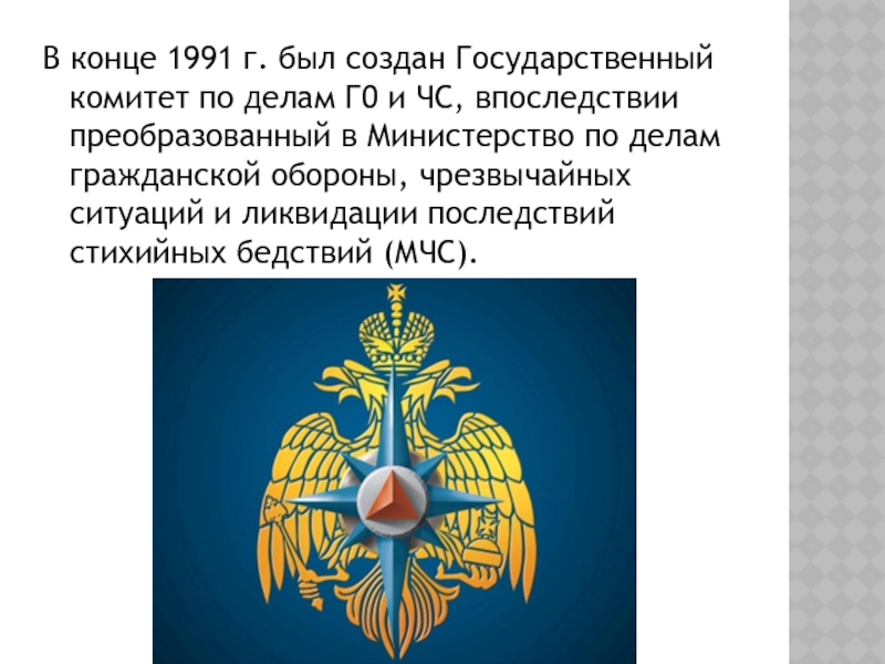 ЧС, впоследствии преобразованный в Министерство по делам гражданской обороны, чрезвычайных ситуаций и ликвидации последствий стихийных бедствий (МЧС).