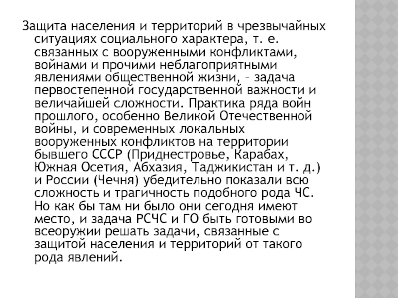 с вооруженными конфликтами, войнами и прочими неблагоприятными явлениями общественной жизни, – задача первостепенной государственной важности и величайшей сложности. Практика ряда войн прошлого, особенно Великой Отечественной войны, и современных локальных вооруженных конфликтов на территории бывшего СССР (Приднестровье, Карабах, Южная Осетия, Абхазия, Таджикистан и т. д.) и России (Чечня) убедительно показали всю сложность и трагичность подобного рода ЧС. Но как бы там ни было они сегодня имеют место, и задача РСЧС и ГО быть готовыми во всеоружии решать задачи, связанные с защитой населения и территорий от такого рода явлений.