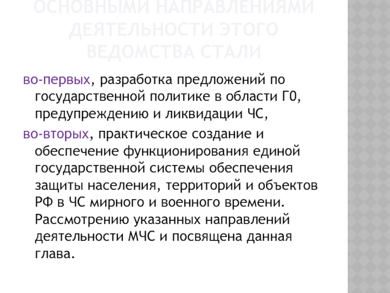 во-вторых, практическое создание и обеспечение функционирования единой государственной системы обеспечения защиты населения, территорий и объектов РФ в ЧС мирного и военного времени. Рассмотрению указанных направлений деятельности МЧС и посвящена данная глава.