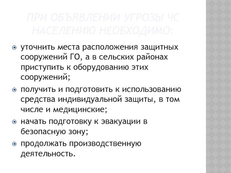 Слайд 20При объявлении угрозы ЧС населению необходимо: