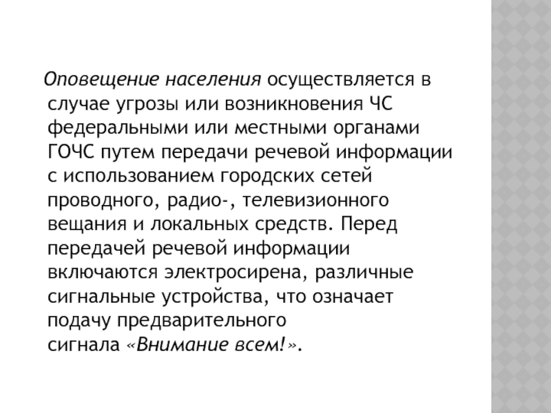 местными органами ГОЧС путем передачи речевой информации с использованием городских сетей проводного, радио-, телевизионного вещания и локальных средств. Перед передачей речевой информации включаются электросирена, различные сигнальные устройства, что означает подачу предварительного сигнала «Внимание всем!».