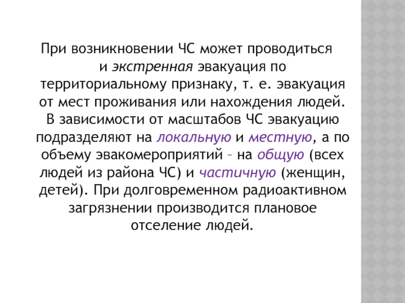 от мест проживания или нахождения людей. В зависимости от масштабов ЧС эвакуацию подразделяют на локальную и местную, а по объему эвакомероприятий – на общую (всех людей из района ЧС) и частичную (женщин, детей). При долговременном радиоактивном загрязнении производится плановое отселение людей.
