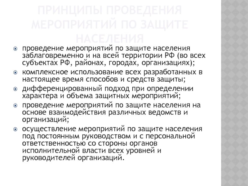 осуществление мероприятий по защите населения под постоянным руководством и с персональной ответственностью со стороны органов исполнительной власти всех уровней и руководителей организаций.