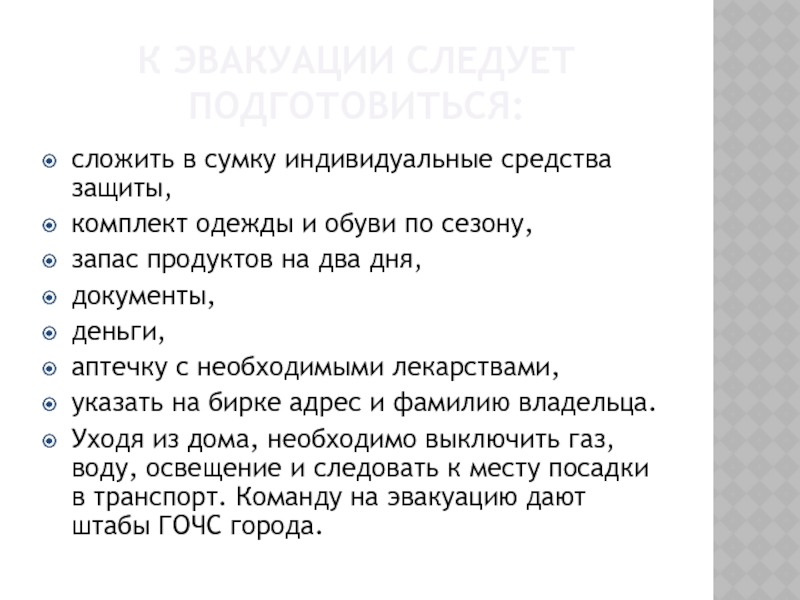 Уходя из дома, необходимо выключить газ, воду, освещение и следовать к месту посадки в транспорт. Команду на эвакуацию дают штабы ГОЧС города.
