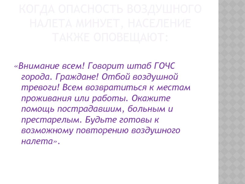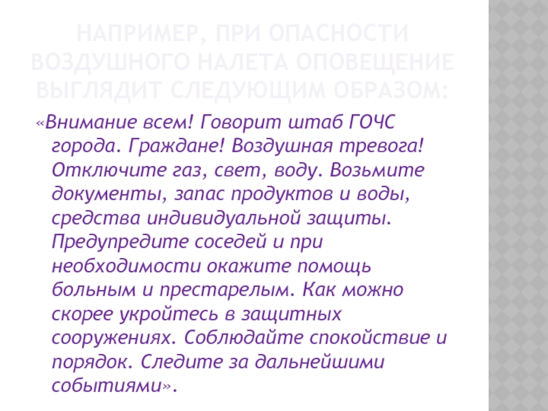 штаб ГОЧС города. Граждане! Воздушная тревога! Отключите газ, свет, воду. Возьмите документы, запас продуктов и воды, средства индивидуальной защиты. Предупредите соседей и при необходимости окажите помощь больным и престарелым. Как можно скорее укройтесь в защитных сооружениях. Соблюдайте спокойствие и порядок. Следите за дальнейшими событиями».