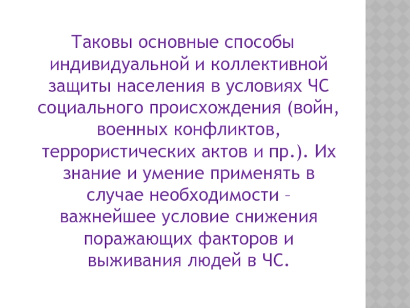социального происхождения (войн, военных конфликтов, террористических актов и пр.). Их знание и умение применять в случае необходимости – важнейшее условие снижения поражающих факторов и выживания людей в ЧС.