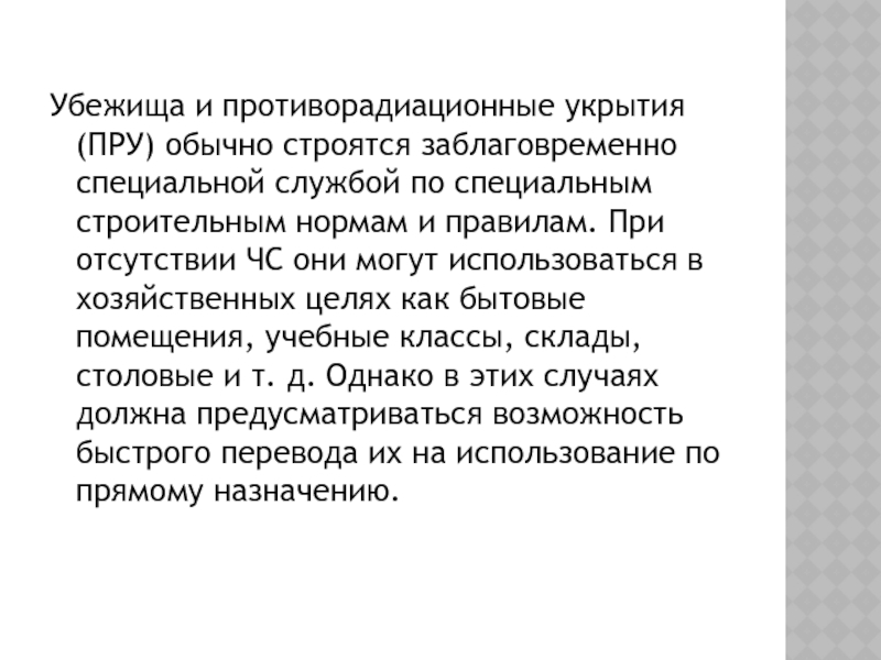 Слайд 22Убежища и противорадиационные укрытия (ПРУ) обычно строятся заблаговременно специальной службой по