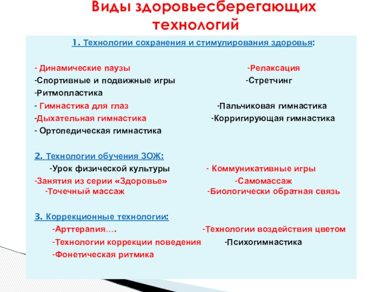 Виды здоровьесберегающих технологий