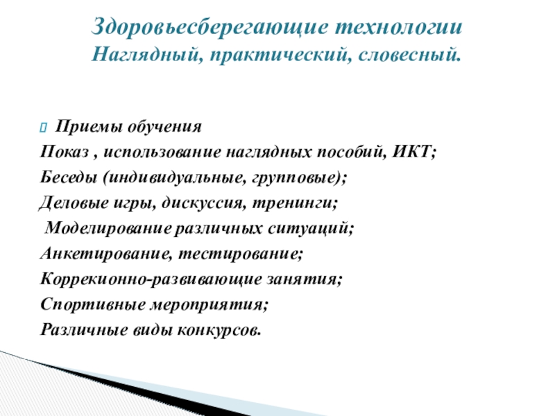Здоровьесберегающие технологии Наглядный, практический, словесный.