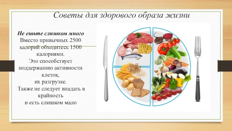 Советы для здорового образа жизниНе ешьте слишком много Вместо привычных 2500калорий обходитесь 1500 калориями.Это способствует поддержанию активности