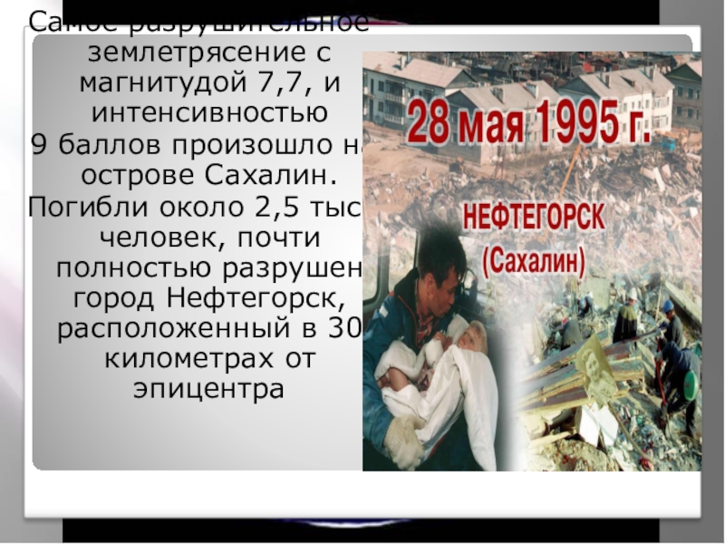 Погибли около 2,5 тыс. человек, почти полностью разрушен город Нефтегорск, расположенный в 30 километрах от эпицентра
